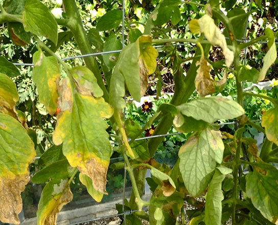 Tratamientos: Manejo adecuado de la ventilación. Evitar una excesiva humedad en el cultivo. Empezar con tratamientos preventivos cuando aparezcan las condiciones climáticas favorables para el desarrollo de la enfermedad. En el huerto hay tratamiento adecuados. Hongos Radiculares: Afectan a casi todas las plantas de nuestro huerto, pero donde los observamos con frecuencia es en el tomate. Se reconoce porque las hojas de los tallos inferiores de la planta se arrugan y posteriormente se secan. Hay que fijarse en la salida del tallo de la tierra y ahí se observa un estrangulamiento de la planta producido por estos hongos.